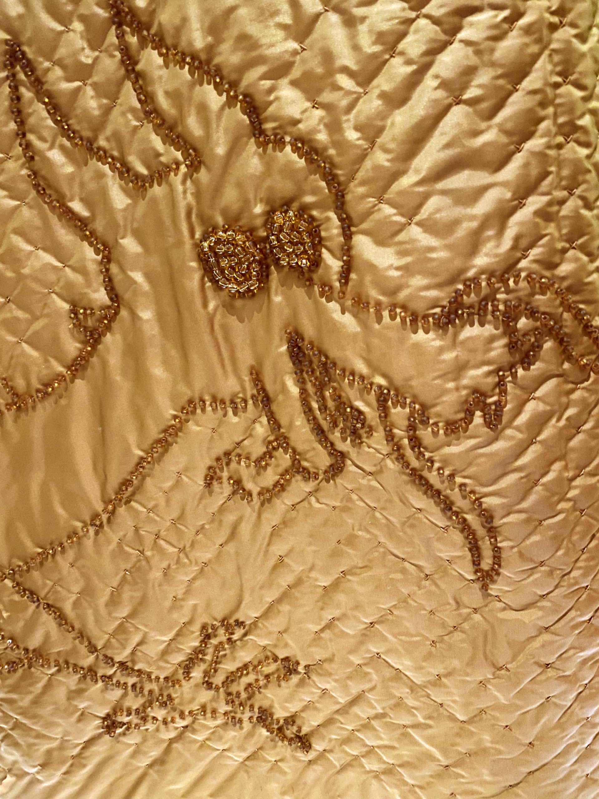 Created by modifying a Claude Montana Vogue pattern (#1483) using a pre-quilted fabric eventually re-covered, quilted by hand and beaded to form the dragon motif.
