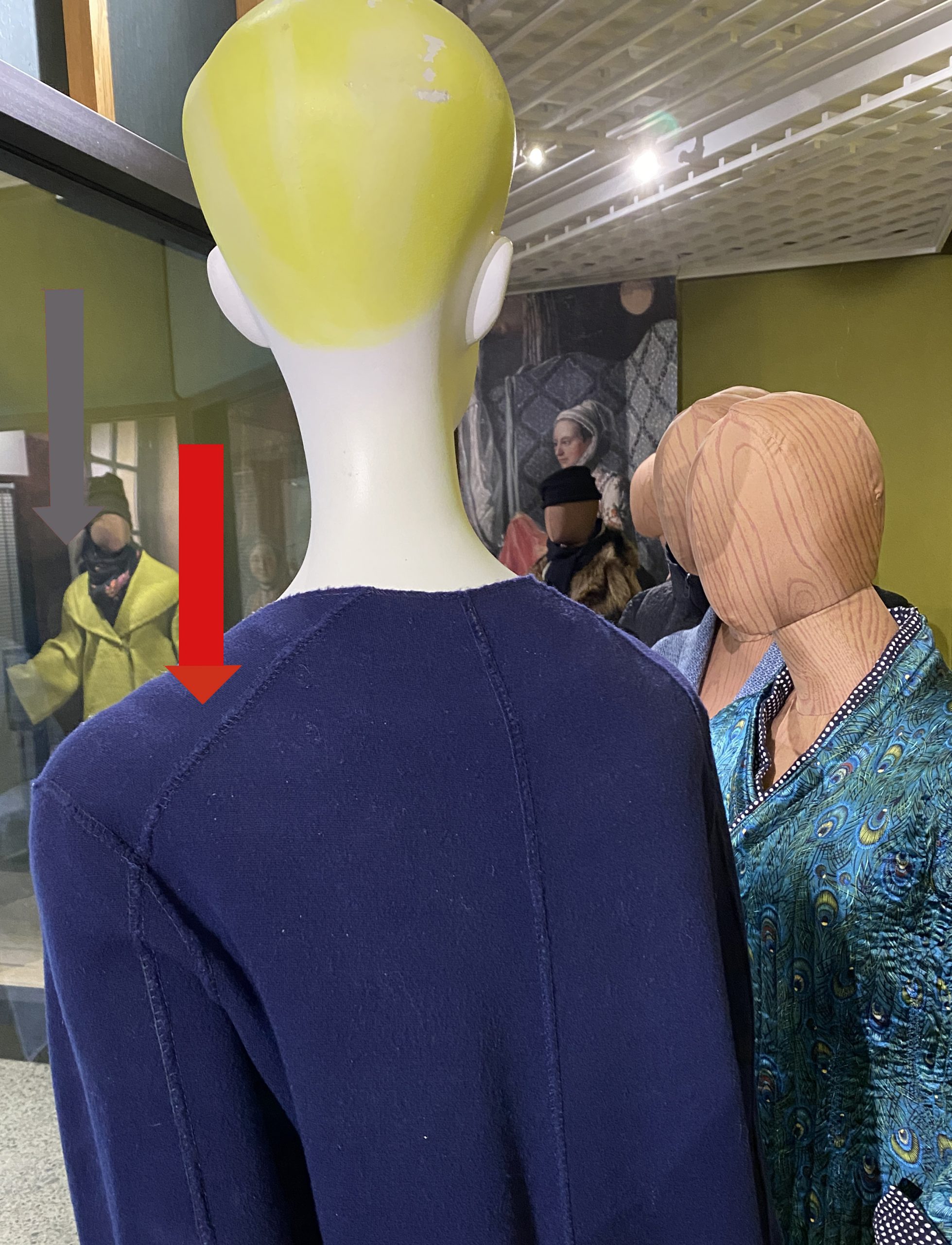 Aims to create a multi-sized garment for museum stores that integrates artwork in its surface design. The work feartured is the 1794 portrait of Marie Louis Josèphe Trudaine, née Micault de Courbeton (1769-1802) by the School of Jacques-Louis David. Musée du Louvre (#RF 670). With sustainability in mind, the dress' pattern is designed for “zero-waste and less-waste” of the fabric, as championed by sustainability advocates Timo Rissanen and Holly McQuillan. Fit may be obtained via a self-fabric belt integrated into the pattern (not shown in the exhibition), which uses all the surface of the fabric for the final design.